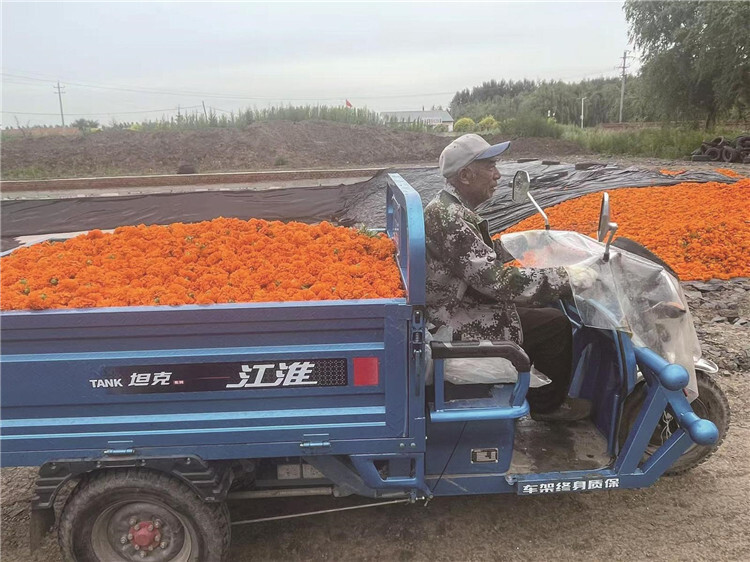 农安县合隆镇战家村的村民告诉记者,他们主要采摘公路两侧万寿菊,每天早上采摘几个小时,然后将采摘好的万寿菊用三轮车拉到回收点。农安县合隆镇万寿菊特色产业孙家窝堡收购站负责人沈永强介绍,这个站点建于2024年4月份,现在每天收购在100吨左右,目前已收购500多吨,在收购站晾晒25天到一个月左右,陆续送到万寿菊生产基地,然后将它加工成颗粒,再转送到集团总部。