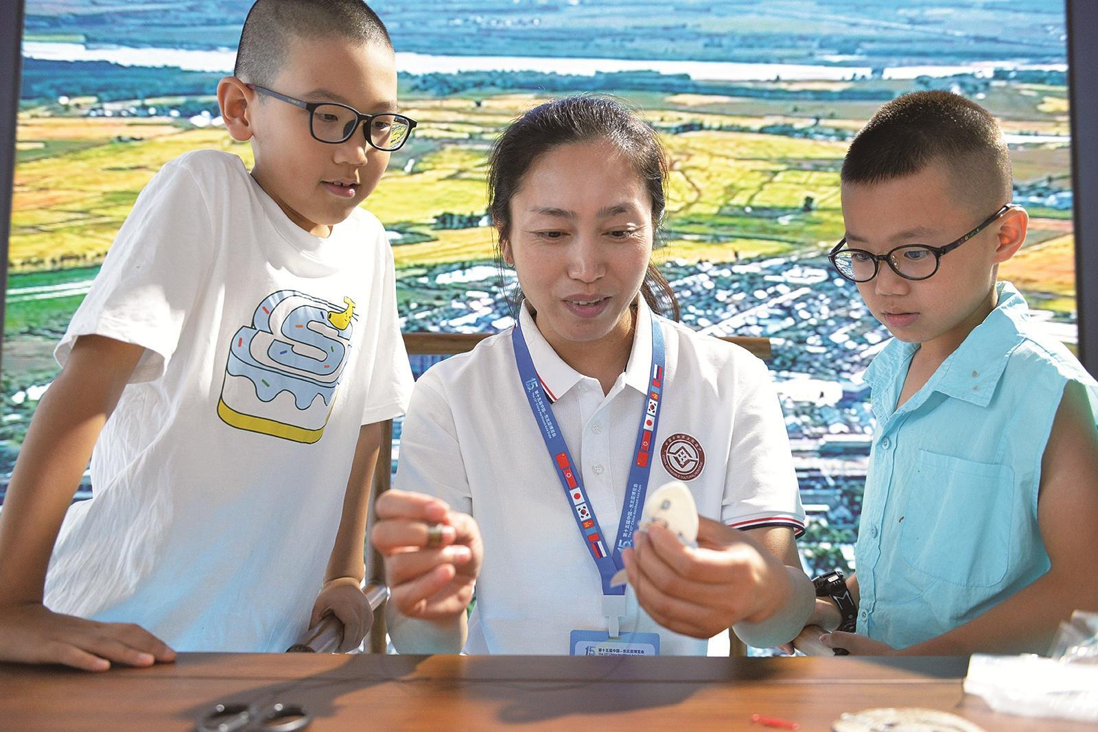 工作人员向小朋友展示非遗鱼皮画制作过程。