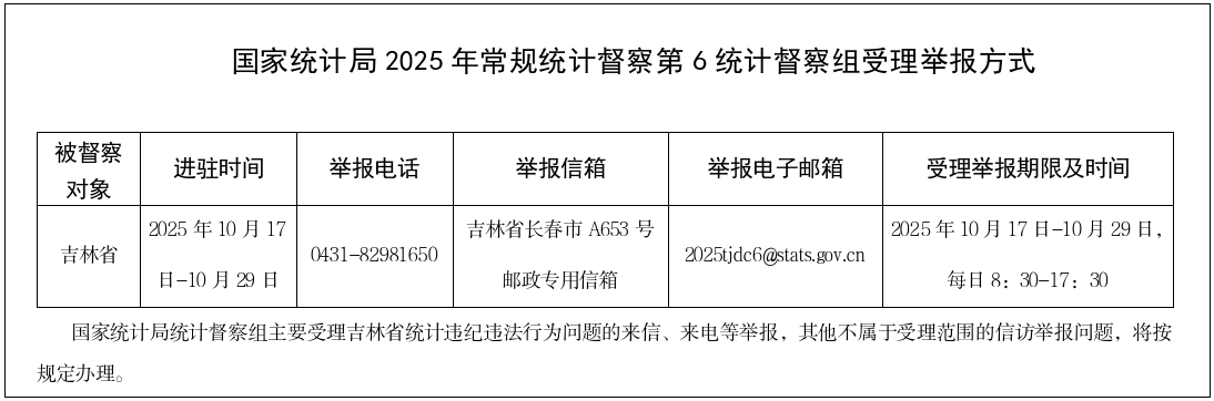 根据党中央和国务院授权,国家统计局2025年常规统计督察第6统计督察组近日进驻吉林省开展统计督察,并于10月17日与省委、省政府进行对接沟通。督察组组长、国家统计局党组成员、副局长阮健弘通报统计督察事宜,提出工作要求。省委书记黄强参加对接沟通并讲话。省委副书记、省长胡玉亭参加对接沟通。