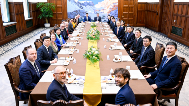 11月26日,省委书记黄强与国际大学生体育联合会主席雷诺·艾德一行在长春松苑咖啡馆茶叙。张野 摄