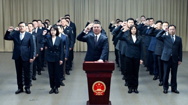 宣誓仪式现场庄严,宣誓台上摆放着《中华人民共和国宪法》,参加宣誓人员全体肃立,奏唱中华人民共和国国歌。随后,领誓人手抚宪法,领诵誓词,其他宣誓人齐声跟诵誓词。