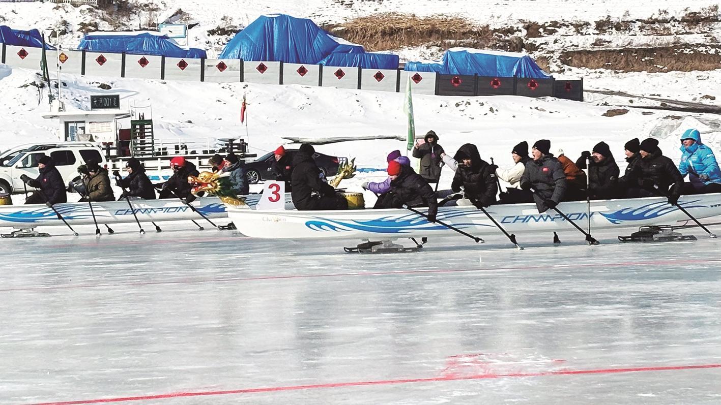 一艘艘冰上龙舟在舵手、鼓手、划桨手共同努力下飞驰前进,奔向终点。
