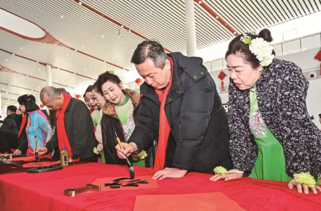现场,悠扬的《春风十里》旋律在候车大厅流转,轻快的歌舞表演《茉莉花》让旅客脸上挂满笑意;“送万福进万家”特色文化活动中,书法老师们凝神运笔,将一副副满载吉祥祝福、带着墨香的春联、“福”字送到旅客手中。驻足、围观、领取、道谢……温暖的互动让候车大厅里溢满了传统年味与温情。