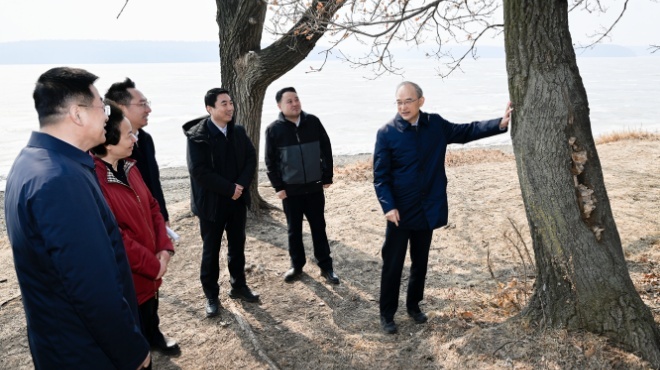3月21日,省委书记黄强在长春净月潭国家森林公园调研,在森林浴场沿着湖岸实地察看土壤侵蚀、树木倒伏等情况。张野 摄