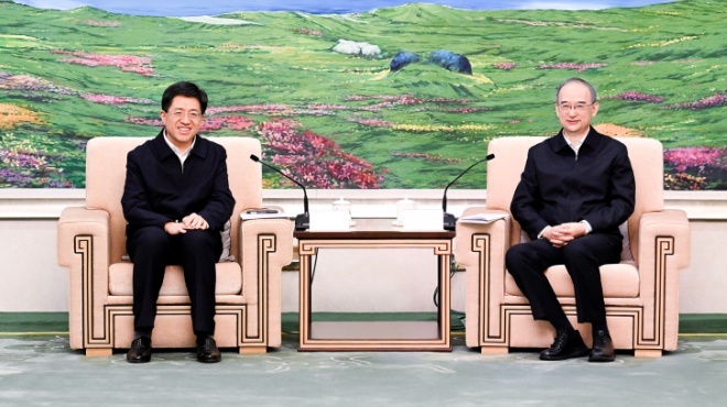 4月22日,省委书记黄强在长春会见团中央书记处第一书记阿东一行。张野 摄