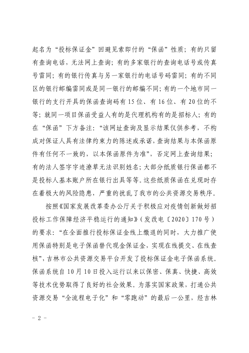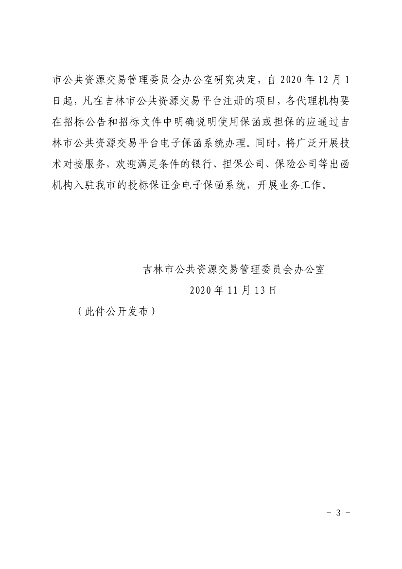 吉林市公共资源交易管理委员会办公室关于全面施行投标保函线上办理的通知吉市公管办发〔2020〕8号