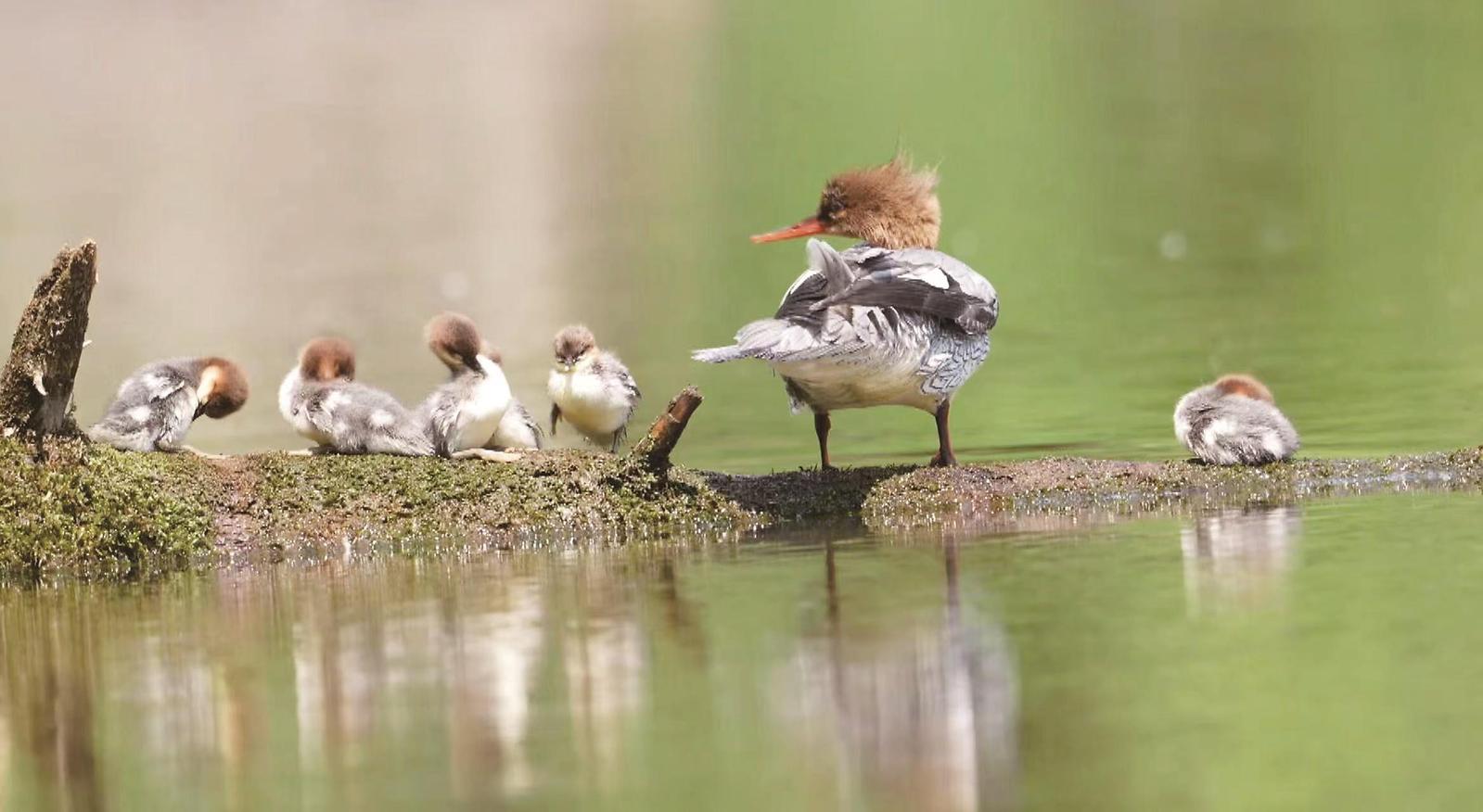 中华秋沙鸭雏鸭梳理羽毛