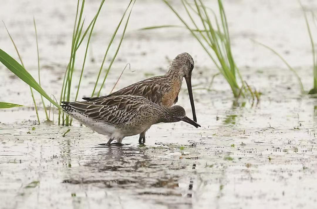 两只半蹼鹬在浅滩中觅食