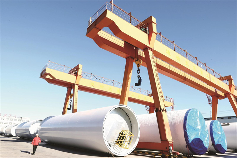 通榆县坚持新发展理念,立足资源优势,围绕“产业立县”发展新质生产力,持续培育清洁能源、绿电工业、生态文旅、品质农业“四个产业”集群。图为通榆天能重工有限公司的风电塔筒生产基地。丁研 摄