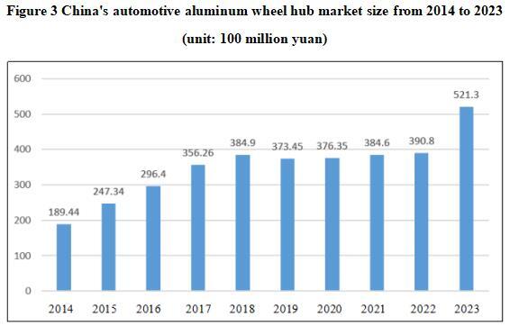 In automotive aluminum wheel hub products, according to their surface treatment processes, it can be divided into coated wheels, polished wheels, electroplated wheels, vacuum electroplated wheels, etc., and each type of wheel hub has its own characteristics and scope of application. According to statistics, the size of China's automotive aluminum wheel hub market reached 52.13 billion yuan in 2023, and the production and demand in the domestic market were 247.48 million and 155.6 million pieces respectively.