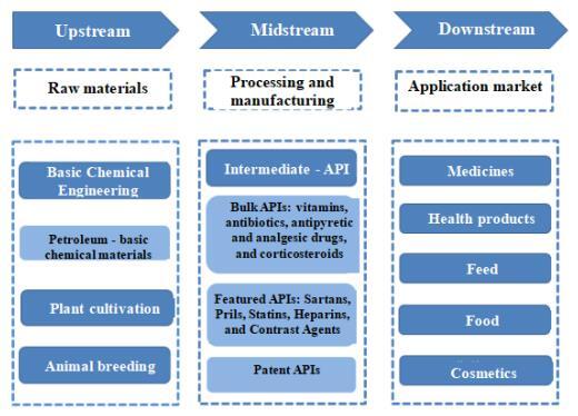 The API industry chain covers the upstream basic chemical industry, agriculture, forestry, animal husbandry, and fishery, mainly including basic chemical industry, plant cultivation, animal husbandry, and some pharmaceutical intermediate system preparation; The production of API in the middle reaches involves the preparation of API through chemical synthesis, animal and plant extraction, microbial fermentation, or other modern biotechnology methods; And multiple links such as downstream chemical production.
