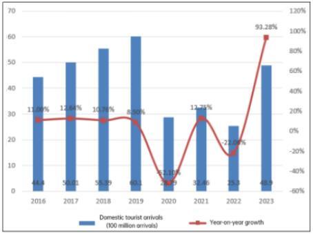 Figure 1 Domestic Tourist Arrivals and Growth in China from 2016 to 2023