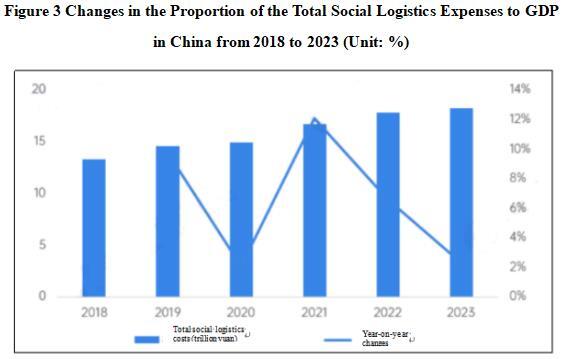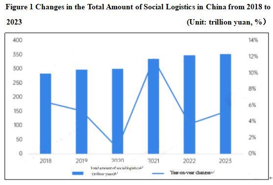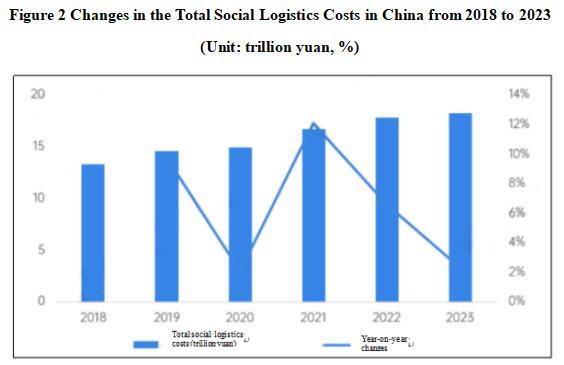 From the perspective of total logistics costs, the total logistics costs in China continue to grow. The total cost of social logistics in 2023 was 17.8 trillion yuan, a year-on-year increase of 2.3%, with a slight decline in growth rate.