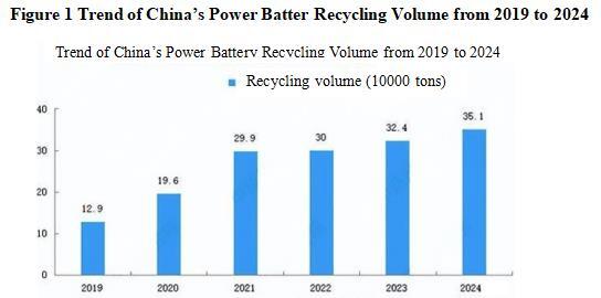 With the centralized retirement of power batteries, China’s power battery recycling industry has entered a period of development. The Research Report on the Development Trends and Investment Risks of China’s Power Battery Recycling Industry from 2024 to 2028 released by China Academy of Commerce Industry Research shows that from 2019 to 2022, the actual recycling volume of power batteries in China increased from 129000 tons to 300000 tons, and reached 324000 tons in 2023. The actual recycling volume of power batteries exceeded 350000 tons by 2024.