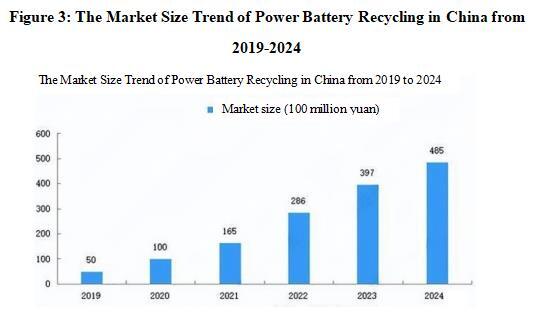 The market size of China’s power battery recycling in 2023 was 39.7 billion yuan. Power batteries generally had a lifespan of 5-8 years. Based on the second cycle from 2020 to 2022, it is expected that a new wave of power battery retirement will occur around 2025. At the same time, coupled with the recent “trade-in” subsidy policy launched by the State Council, the power battery recycling industry is expected to face a huge demand. The size of China’s power battery recycling market exceeded 48 billion yuan by 2024.