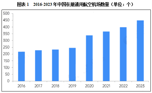 据中国AOPA通用机场研究中心数据,2016-2023年,我国颁证通用航空机场数量呈现增长状态。截至2023年12月31日,全国在册通用机场已达449个,其中取得通用机场使用许可证的机场106个,通过通用机场信息管理系统完成备案的机场(B类通用机场和仅供直升机起降的A类通用机场)343个。