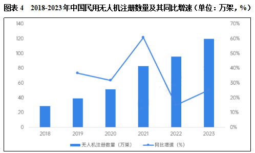 随着我国人均消费水平以及无人机技术水平的提高,公众对智能生活的需求增大,带动民用无人机行业发展,注册数量快速增长。根据中国民用航空局公布的数据,2023年,全国民用无人机注册数量达120万架,同比增长25%。