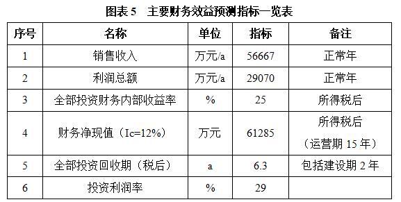 项目达产后,年销售收入56667万元,利润29070万元,投资回收期6.3年(税后,含建设期2年),投资利润率29%。