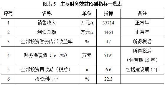 项目达产后,年销售收入35714万元,利润4464万元,投资回收期6.6年(税后,含建设期1年),投资利润率22.3%。