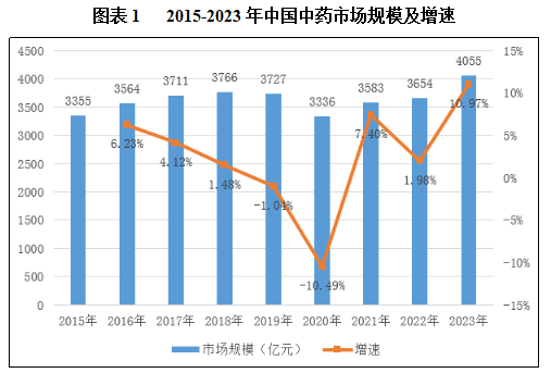 中药企业将人参作为药品原材料,消费者则直接使用各类人参用品,包括人参食品、保健品、化妆品等。2023年中药约占整体医药市场规模的23.7%。2015-2023年我国医院+药店中药市场规模亦保持逐年增长,年复合增长率为2.58%,略低于医药行业整体增速;2023年全国中药市场规模超4000亿元。