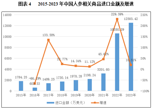 中国海关数据显示,2017年以来,中国人参相关商品总进口量波动增加,进口金额逐年增加。2022年中国人参相关商品进口量达3693.1吨,同比增长了3619.67吨,增长了49倍;进口金额达10550.39万美元,同比增长了7349万美元,增长了2倍;进口量及进口金额的增长均来自“鲜或干的西洋参”的拉动。2023年,中国人参进口量已增至5753.17吨,净进口量为3582.63吨;进口金额随贸易量同步增至12503.42万美元。