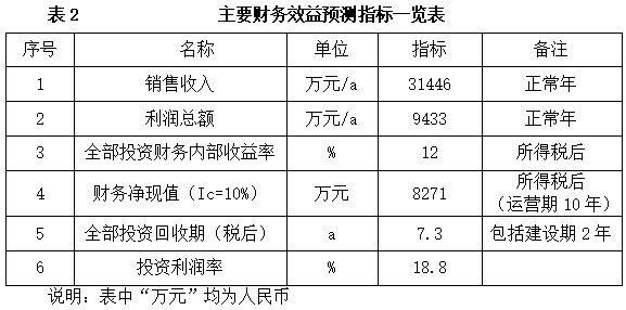 项目达产后,年销售收入31446万元,利润9433万元,投资回收期7.3年(税后,含建设期2年),投资利润率18.8 %。