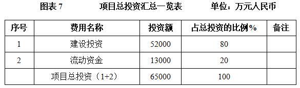 本项目总投资为65000万元,其中:建设投资52000万元,流动资金13000万元。