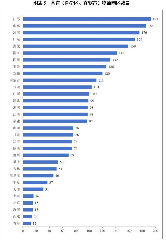 物流园区总数前三名的省份分别为江苏、山东、河南。全国有12个省份物流园区数量达100个以上。