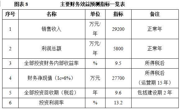 项目达产后,年销售收入29200万元,利润5800万元,投资回收期9.6年(税后,含建设期2年),投资利润率13.2%。