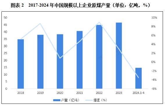2017-2023年,全国规模以上企业原煤产量持续增长,2021年突破40亿吨,2023年达到46.60亿吨,较2022年增长了2.9%。2024年1-4月,全国规模以上企业共生产14.80亿吨原煤,较2023年同期下降了3.5%。