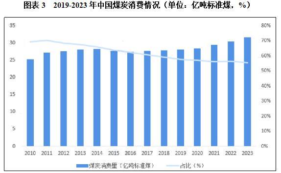 2010年以来,全国煤炭消费量持续增长,2022年突破30亿吨标准煤,2023年达到31.63亿吨标准煤。从全国能源消费总体情况来看,煤炭仍是主要的消费能源,但占比近年来呈下降趋势,从2010年的69.2%降至2023年的55.3%。