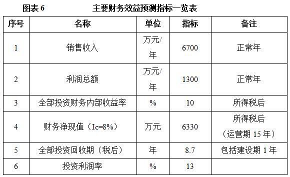 项目达产后,年销售收入6700万元,利润1300万元,投资回收期8.7年(税后,含建设期1年),投资利润率13%。