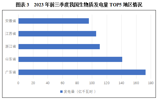 目前,广东省、山东省、浙江省、江苏省、安徽省是我国生物质发电主要发电地区,2023年前三季度发电量分别达到172.9亿千瓦时、141.1亿千瓦时、110.6亿千瓦时、105.7亿千瓦时和95.6亿千瓦时。