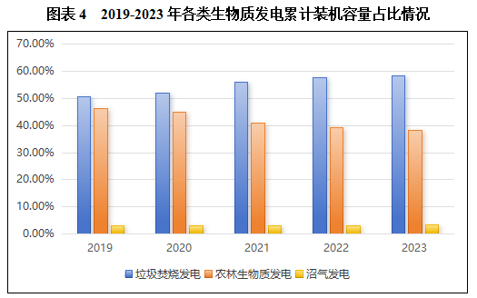 生物质发电主要包括农林生物质发电、垃圾焚烧发电、沼气发电等。近年来,随着我国垃圾无害化处理系统的健全与完善,生活垃圾处置能力不断加强,对于垃圾焚烧的需求也在日益增加,使得生活垃圾焚烧发电累计装机容量在生物质发电市场中的占比不断提升,由2019年的50.48%上升至2023年的58.38%。农林生物质发电面临着成本相对较高,且盈利模式相对单一等问题,也因此,其累计装机容量增长速度要小于垃圾焚烧发电,且在生物质发电市场中的占比呈现下降态势,由2019年的46.39%下降至2023年的38.24%。沼气发电累计装机容量占比则始终很小,不足4%,2023年达到3.38%。