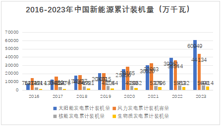 风力发电累计装机量:2023年,装机容量达到44134万千瓦,同比增长20.7%。新增装机7937万千瓦,同比增长59.3%,创历史新高,其中,陆上风电新增7219万千瓦,海上风电新增718.3万千瓦。太阳能发电累计装机量:装机容量达60949万千瓦,同比增长55.2%,新增并网太阳能发电装机超过2亿千瓦,核能发电累计装机量:装机容量为5691万千瓦,同比增长2.4%。新增商运核电机组2台,新开工核电机组5台,在运核电机组55台,总装机容量57吉瓦。发电量4347.2亿千瓦时,同比增长4.1%,占全国累计发电量的近5%。生物质能发电累计装机量:并网装机容量约4414万千瓦,较上年增加282万千瓦,2023年上网电量约1667亿千瓦时。
