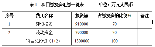 本项目总投资为1300000万元,其中:建设投资910000万元,流动资金390000万元。