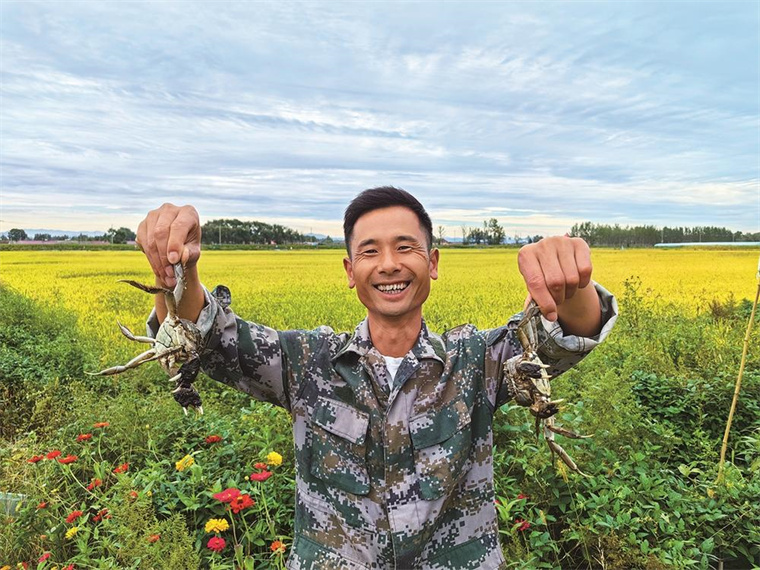 刘博捞起个大肥美的稻田蟹,脸上洋溢着收获的喜悦。 孙池 摄