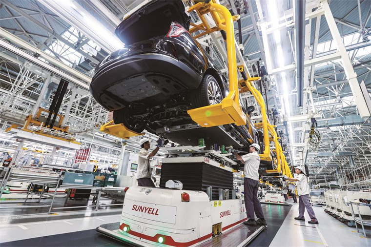 多年来,中国一汽勇担产业使命,坚持创新驱动,累计突破高效高速电驱、智能线控底盘等数百项关键核心技术。这是在一汽红旗繁荣工厂总装车间,工人正在进行电池合装作业。