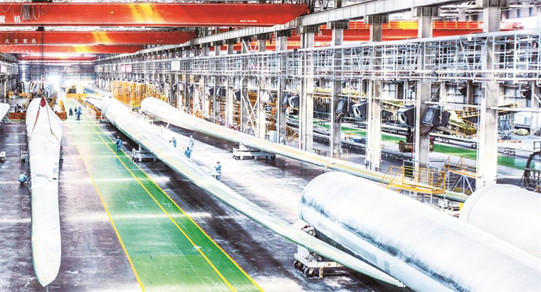 中车松原新能源产业基地项目始终将技术创新作为发展的核心驱动力。在风电整机设计、电机优化、叶片制造及储能系统等方面,均取得了显著成果。图为风车叶片生产车间。