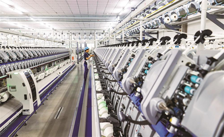 日前,吉林化纤年产2万吨高档涡流纺纱线项目正式开车投产。该项目是企业产品结构调整,实现产业一体化发展的重要项目。项目采用国际上先进的涡流纺纱技术,与传统环锭纺纱相比具有生产流程短、效率高、适纺性强等优势。图为纺纱车间涡流纺生产线。