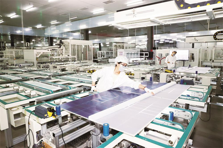 目前,松原正泰新能源智能电气产业园已具备年产6GW高效光伏组件的生产能力,日产光伏板可达1万块,日产值高达1000万元。随着项目的逐步推进,预计年可实现产值38.5亿元,并带动就业1300余人。图为项目生产车间。