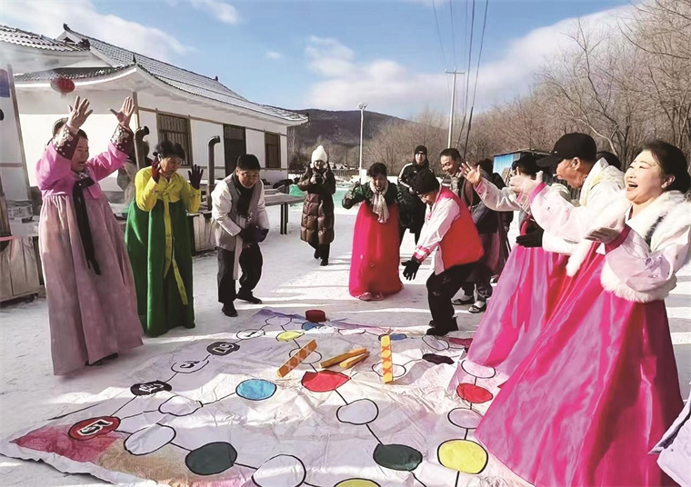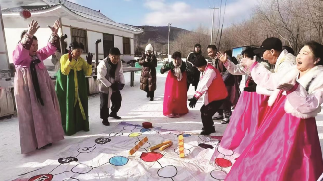 日前,在“长白天下雪·吉美在延边”2024-2025年汪清县“虎豹嬉冰雪”冬季系列活动暨新春民俗荟·一起过新年活动中,汪清县东光镇磨盘山村村民向游客展示朝鲜族特色游戏“尤茨”。 汪清县委宣传部 供图