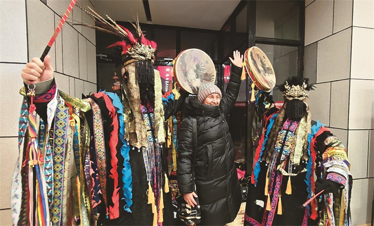俄罗斯游客在珲春市防川风景区体验萨满文化。 张琰 摄