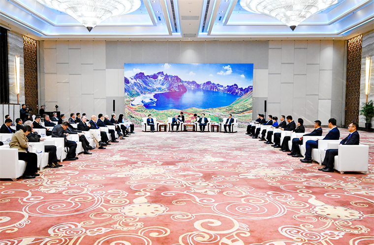 12月14日晚,省委书记景俊海,省委副书记、省长胡玉亭会见参加第七届吉林冰雪产业国际博览会开幕式的国内外重要嘉宾,并共同出席“长白天下雪”品牌全球发布会。张野 邹乃硕 摄