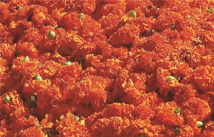 农安县合隆镇陈家店村党支部书记武兴亮介绍,这些金灿灿的万寿菊是该村增收致富的“黄金产业”。今年,合隆镇万寿菊种植面积显著扩大,已形成规模化特色农业。从今年4月开始,万寿菊进入移栽阶段,7月迎来花期,每10天就可采摘一茬,一直持续到10月。