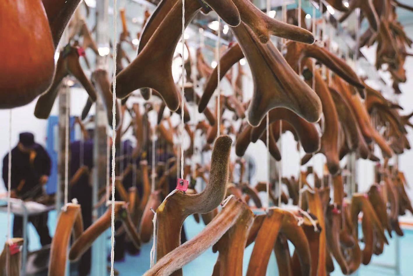 东丰县“皇家围场1619”生产车间里加工好的鹿茸正在风干架上自然风干。