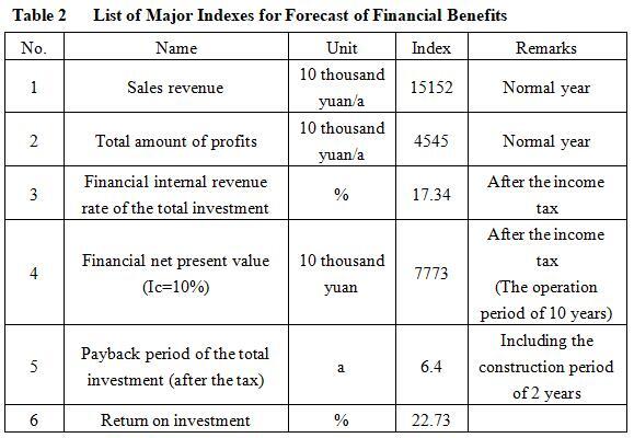 After the project reaches the production capacity, its annual sales income will be 151.52 million yuan, its profit will be 45.45 million yuan, its investment payback period will be 6.4 years (after the tax, including the construction period of 2 years) and its investment profit rate will be 22.73%.