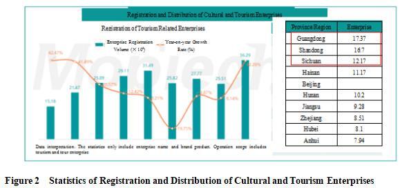 After the pandemic, cultural and tourism consumption quickly recovered, with 362,900 tourism related enterprises registered in 2023 and a year-on-year increase of 42.28%. From the perspective of various provinces, Guangdong Province, Shandong Province and Sichuan Province are the top 3 in the existing tourism related enterprises.