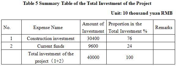 The total investment of this project is 400 million yuan, including construction investment of 304 million yuan and working capital of 96 million yuan.