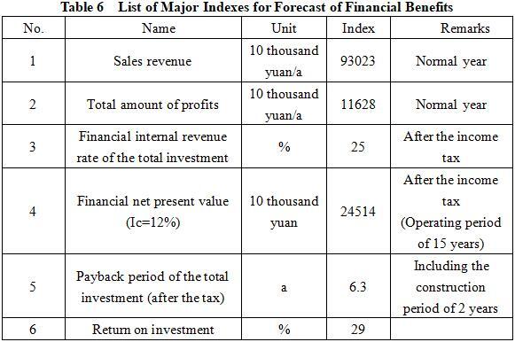 After the project reaches its production capacity, the annual sales revenue is 930.23 million yuan, the profit is 116.28 million yuan, the investment payback period is 6.3 years (after tax, including a construction period of 2 years), and the investment profit margin is 29%.